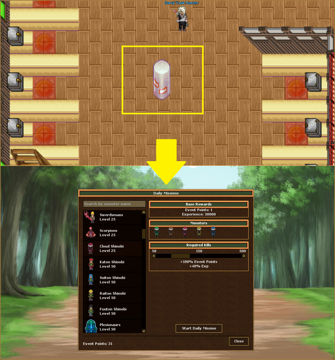 You are able to take a quest from a special column and select a certain type of monsters to complete the daily quest.You will also be able to manipulate the amount of monsters to increase the amount of exp and event points.